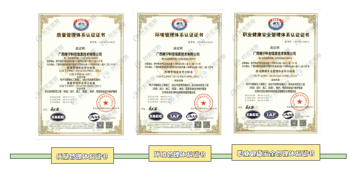 近日,广西南宁科宏信息技术有限公司(简称“科宏信息”)顺利通过三标管理体系认证审核,并获得北京东方纵横认证中心有限公司颁发的《质量管理体系认证证书》、《环境管理体系认证证书》及《职业健康安全管理体系认证证书》。